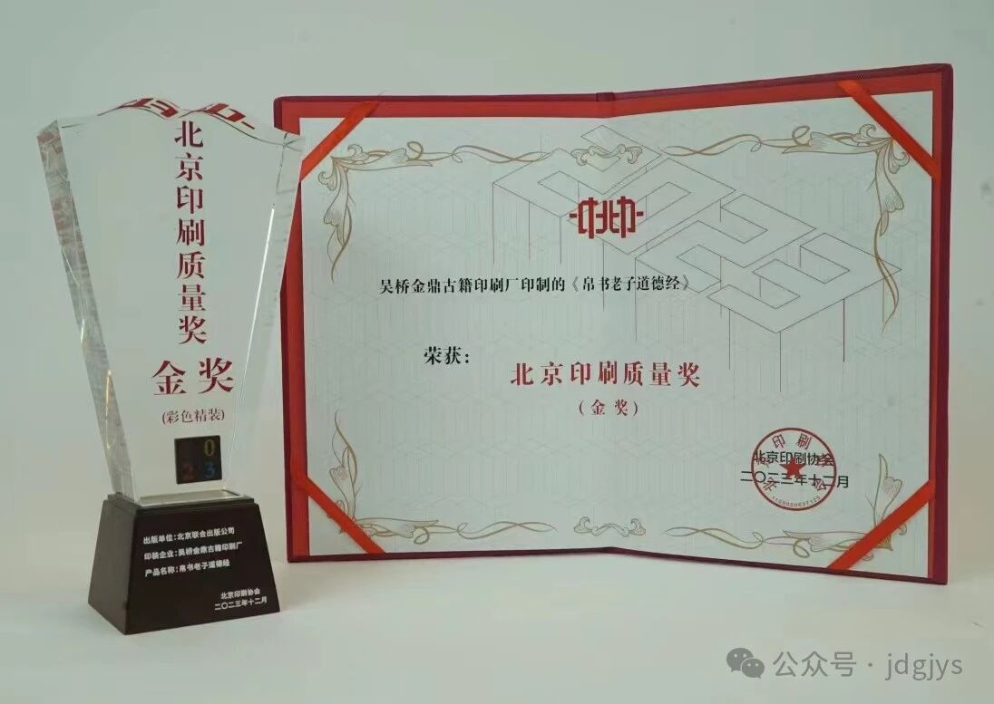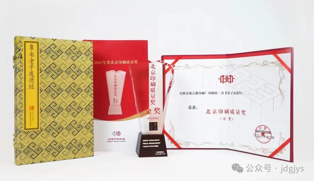 参加此次评选的图书数量为历年最高,近47500种产品送评。吴桥金鼎古籍印刷厂印制的《帛书老子道德经》,凭借其精湛的印刷技艺和精美的线装书工艺,在众多参选产品中脱颖而出,荣获了北京印刷质量奖金奖!!!